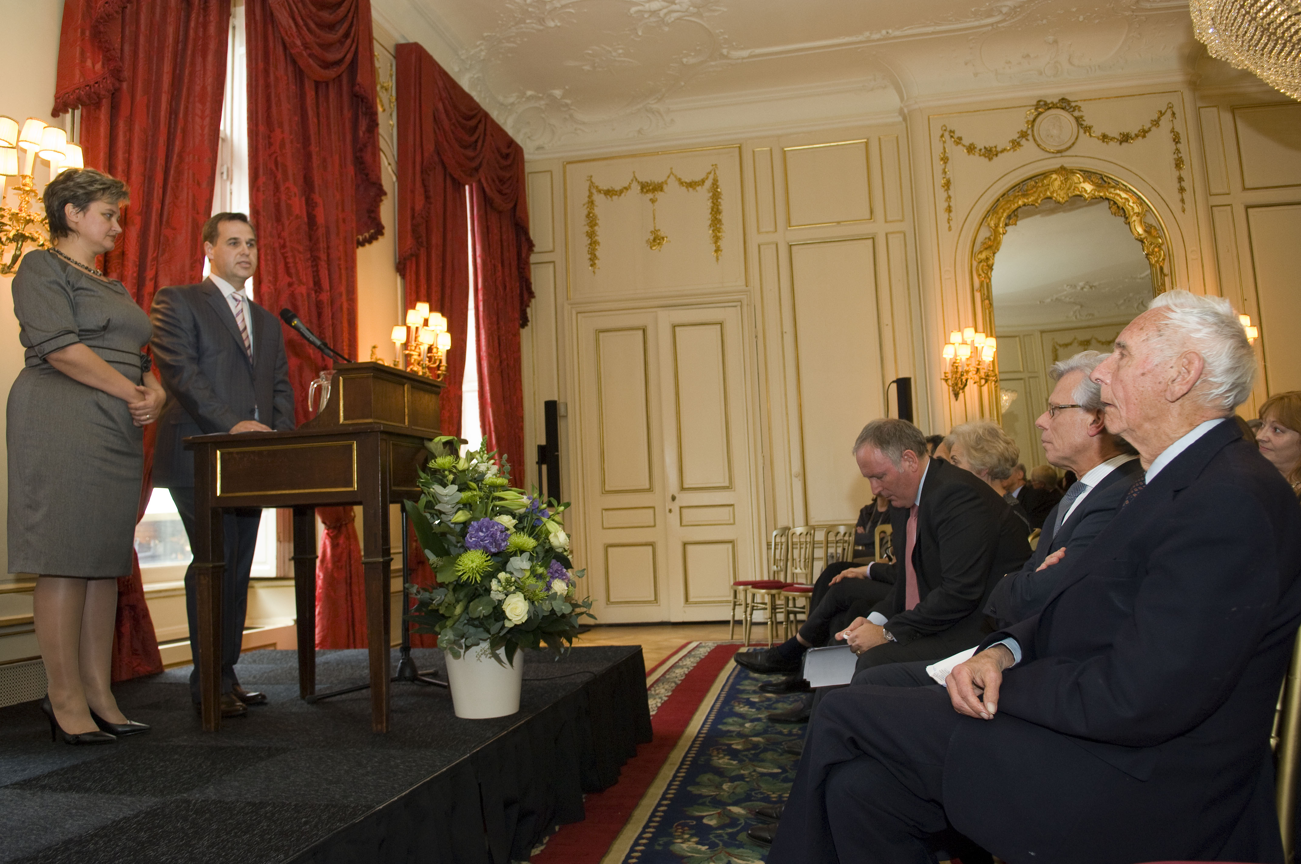 L-r: Margarita Aradzhyonia and Oleg Smirnov collect the 2009 Max van der Stoel award on behalf of the Ukrainian NGO Integration and Development Centre for Information and Research, The Hague, 14 October 2009.