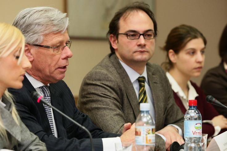 Knut Vollebaek (l), the OSCE High Commissioner on National Minorities, speaks at the presentation of a study on higher education needs in Serbia's Presevo and Bujanovac municipalities. Belgrade, 3 March 2010.