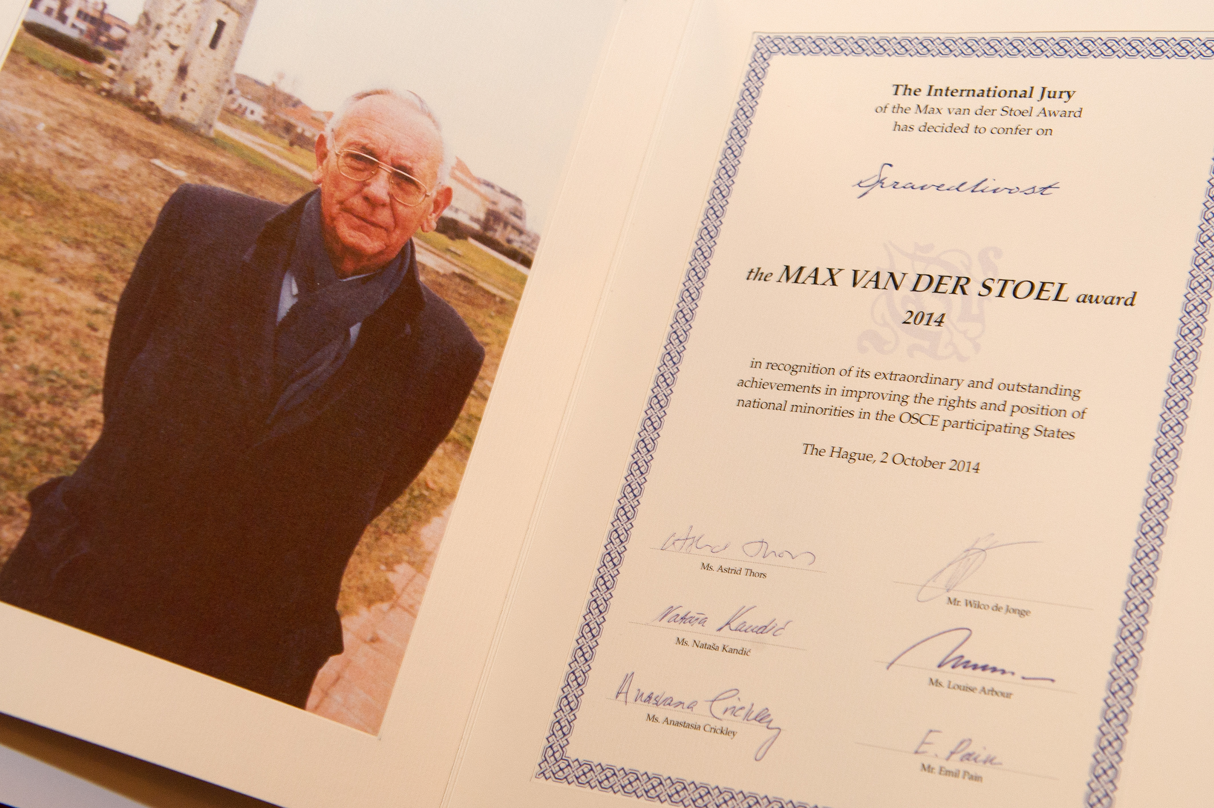 The Max van der Stoel Award certificate presented to NGO Spravedlivost, The Hague, 2 October 2014.