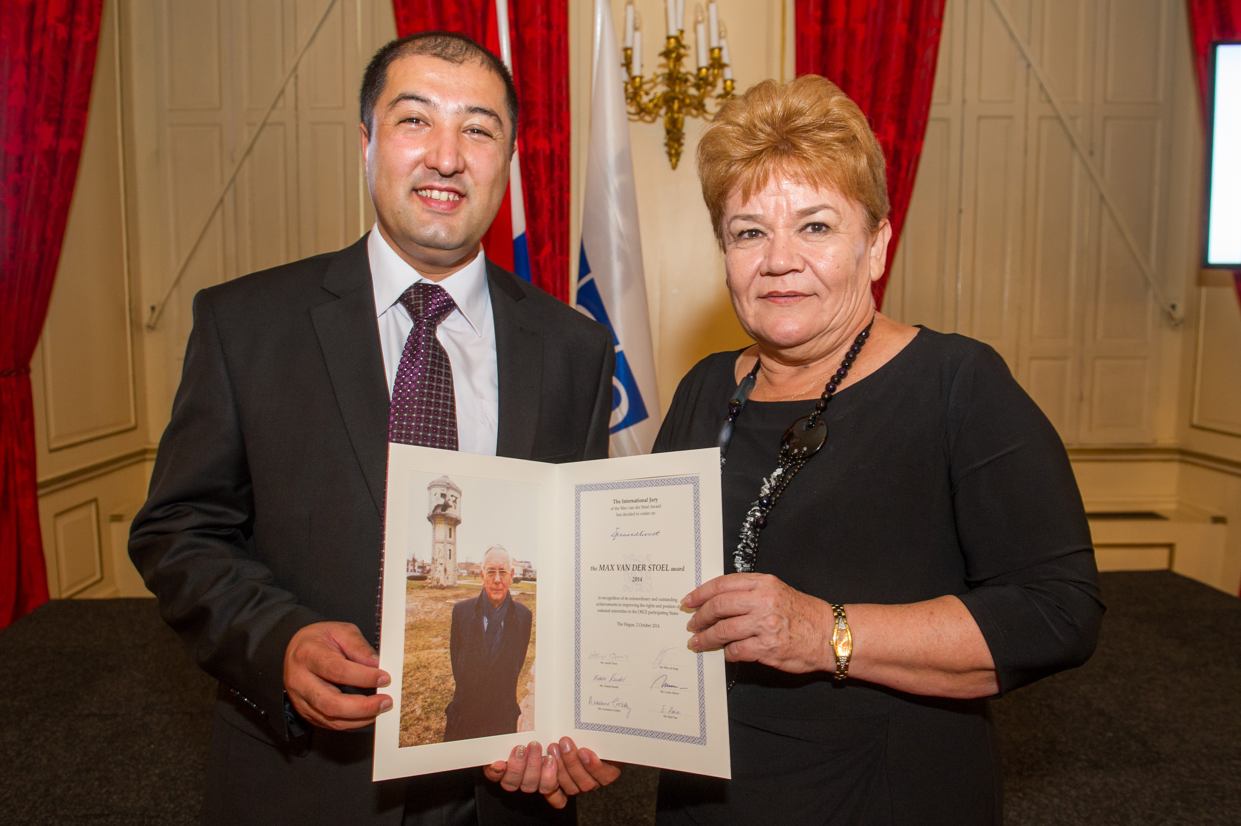 Winners of the Max van der Stoel Award, Valentina Gritsenko (r), Director of human rights NGO Spravedlivost, and Utkir Dhzabbarov (l), Senior Lawyer of Spravedlivost, The Hague, 2 October 2014.