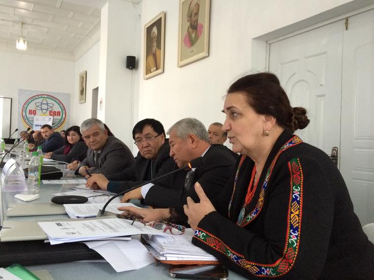 Irina Karimova, President of the Academy of Education of the Republic of Tajikistan (r), addresses participants at a roundtable meeting on multicultural and multilingual education, Dushanbe, 5 December 2014.