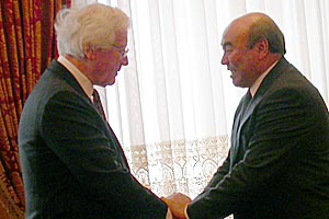 The OSCE's High Commissioner on National Minorities, Rolf Ekeus (left), meets Kyrgyz President Askar Akayev in Bishkek, 14 April 2003.