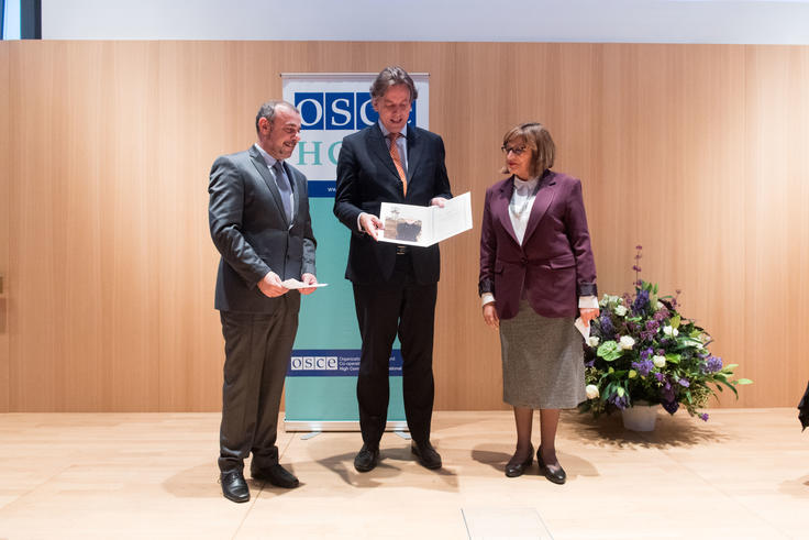 Dutch Minister of Foreign Affairs Bert Koenders presents the the Max van der Stoel Award 2016 to Alev Tuğberk and Kyriakos Pachoulides, co-presidents of the Association for Historical Dialogue and Research, a Cyprus-based non-governmental organization that works on using history teaching as a tool for reconciliation in Cyprus, The Hague, 24 October 2016.