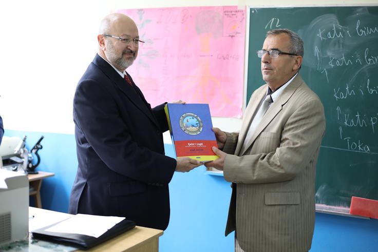 OSCE High Commissioner on National Minorities Lamberto Zannier presents the first ever children’s illustrated Serbian-Albanian/Albanian-Serbian dictionary (Mali rečnik/Fjalor i vogël) to Vesel Sejdiu, director of Naim Frasheri primary school in Bujanovac, 4 October 2017.