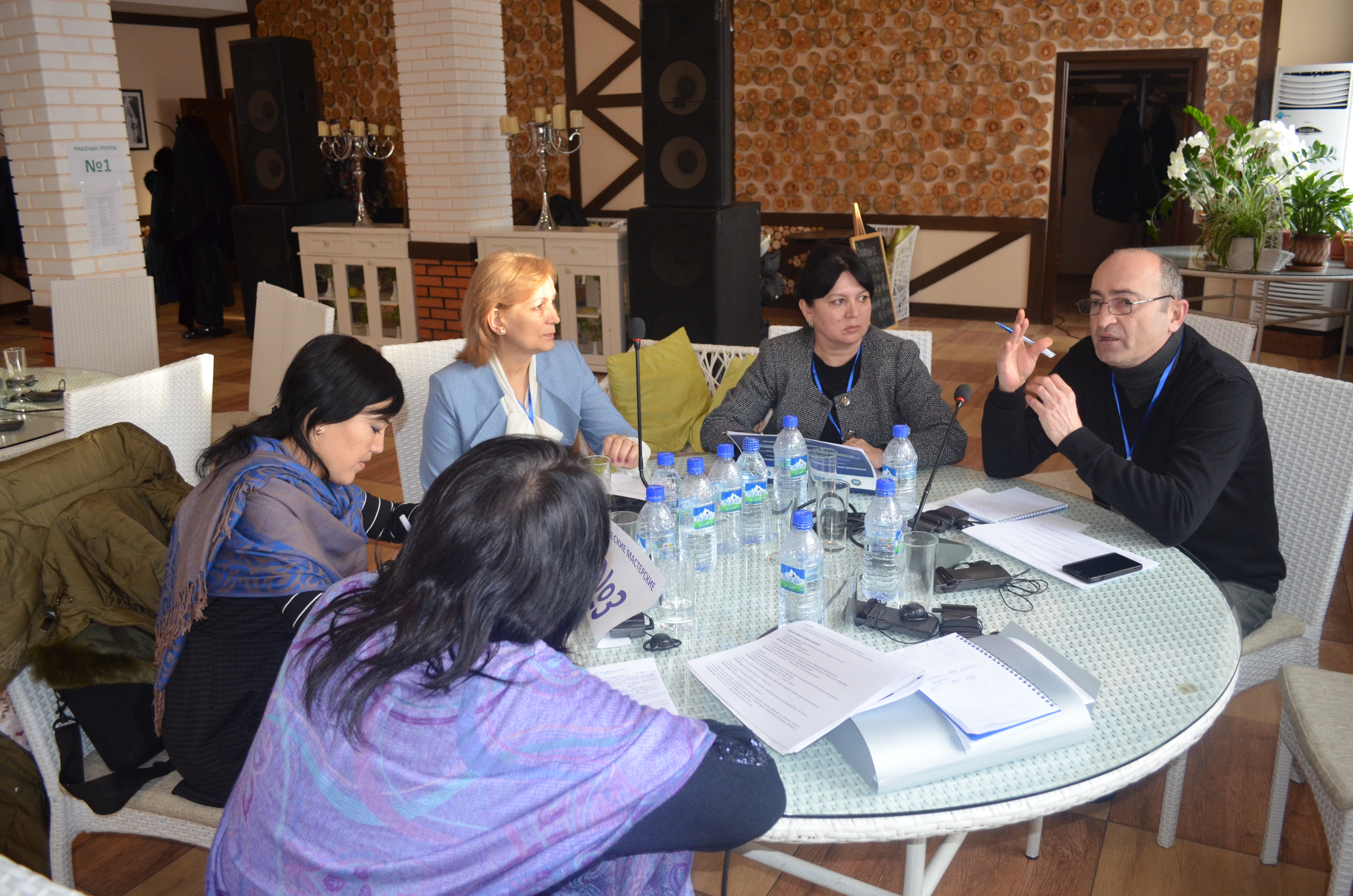 HCNM Education Expert Atanasia Stoianova (centre) works with a small group of participants from Georgia, Kyrgyzstan and Kazakhstan on developing recommendations for creating content-language integrated learning (CLIL) programmes for higher education institutions during the first “Eastern Europe, Caucasus, Central Asia School on Multilingual and Multicultural Education for Integration and Sustainable Development”, organized by the HCNM and the ORLEU National Centre for Professional Development in Shymkent, Kazakhstan, 4 to 8 December 2017.