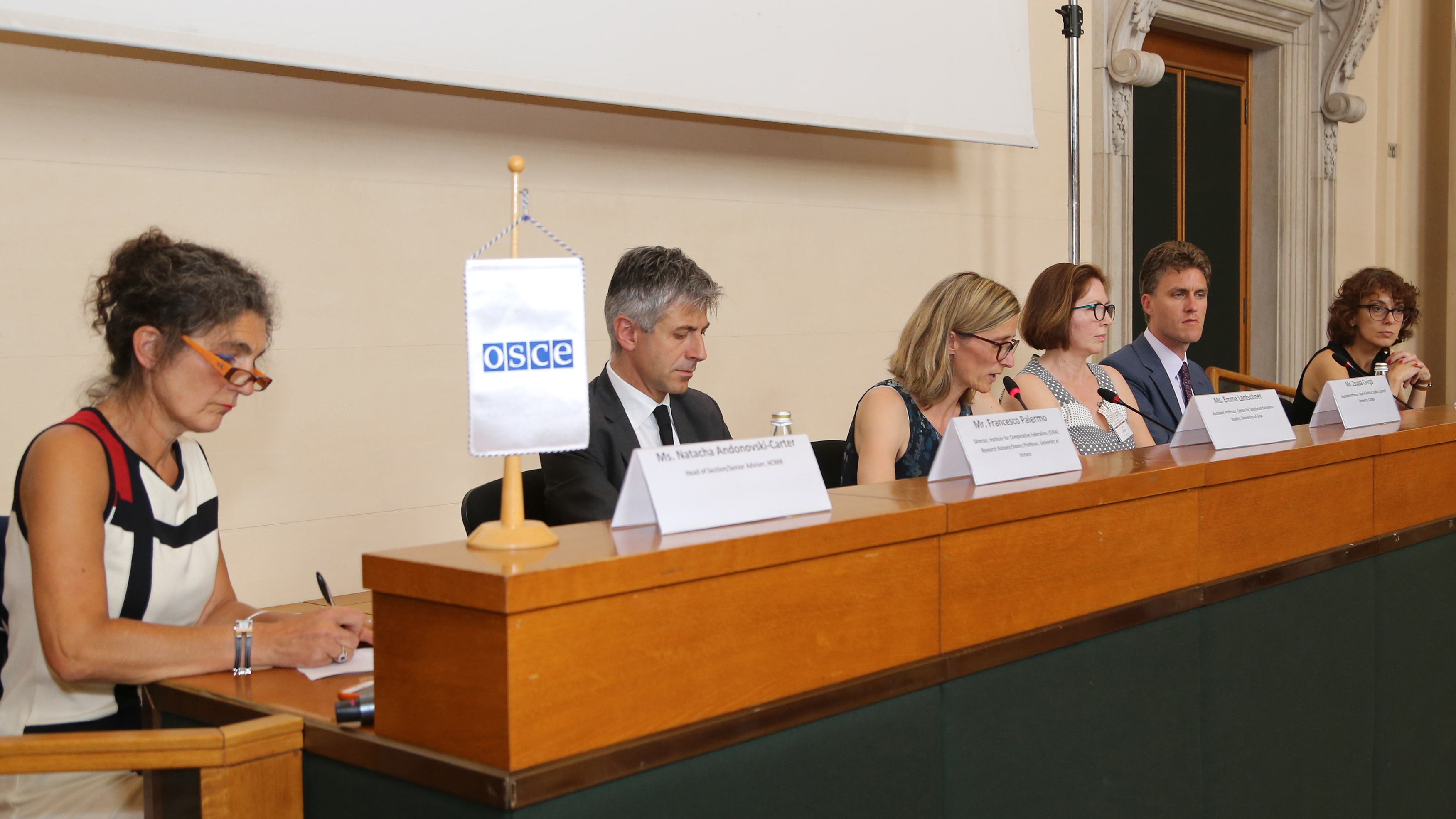 Natacha Andonovski-Carter, Head of Section/Senior Adviser at the HCNM; Francesco Palermo, Director at the Institute for Comparative Federalism of the EURAC Research Bolzano/Bozen and Professor at the University of Verona; Emma Lantschner, Assistant Professor at the Centre for Southeast European Studies at the University of Graz; Zsuzsa Csergő, Associate Professor and Head of Political Studies at the Queen’s University Canada; Bob Deen, Head of Section/Senior Adviser at the HCNM; Natalie Sabanadze, Ambassador of Georgia to Belgium and Luxembourg and Head of Mission to the EU; at the conference “The 10th Anniversary of the Bolzano/Bozen Recommendations on National Minorities in Inter-State Relations: new challenges and lessons learned”, Udine, Italy, 16 July 2018.