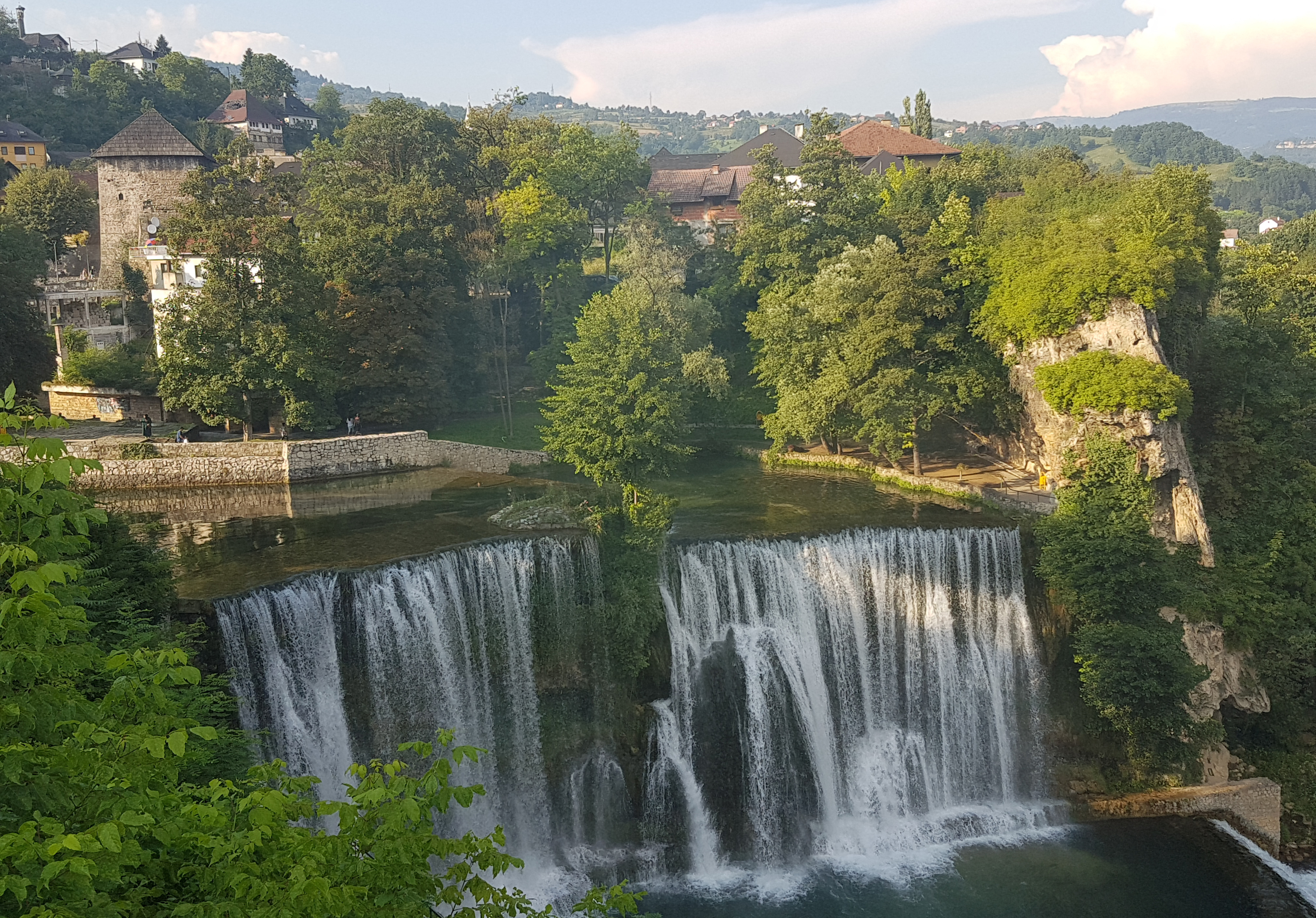 Pliva waterfall: one of the most renowned features in the town of Jajce, Bosnia and Herzegovina, 10 September 2018.