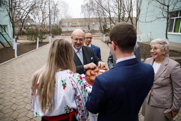 OSCE High Commissioner on National Minorities Lamberto Zannier breaks bread on a visit to Mihai Eminescu High School, a Romanian language school in Comrat, 29 January 2020.