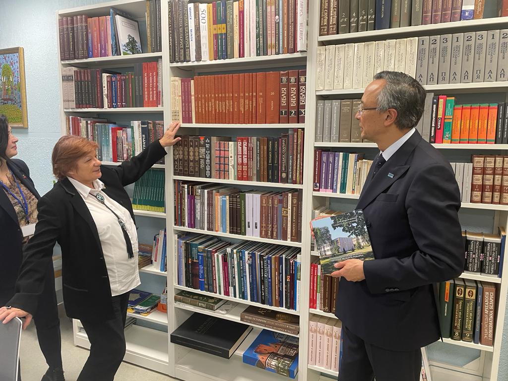 From left: Vilnius Phranciskaus Skorinos Gymnasium librarian shows OSCE High Commissioner on National Minorities Kairat Abdrakhmanov the educational facilities, Vilnius, 8 November 2022.