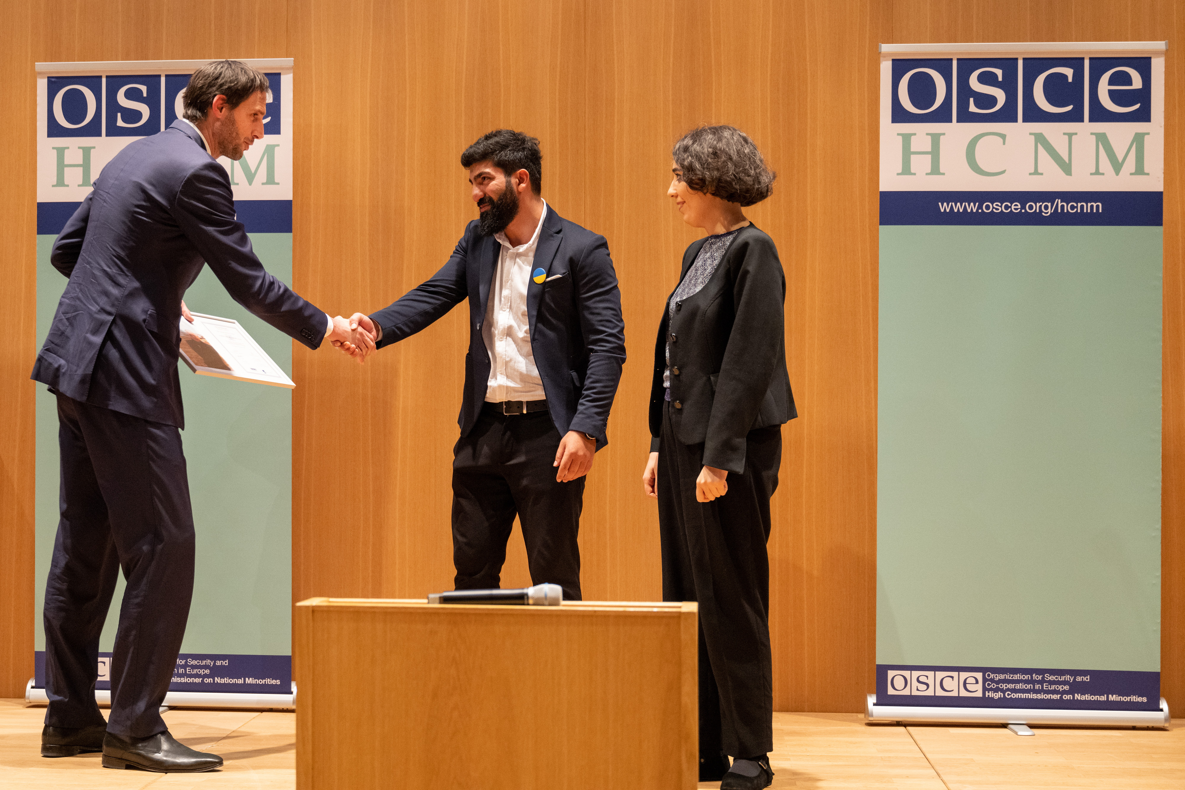 Dutch Foreign Minister Wopke Hoekstra (left) presents the 2022 Max van der Stoel Award to Kamran Mammadli and Tamta Mikeladze of the Social Justice Center, from Georgia, 24 November 2022, The Hague.