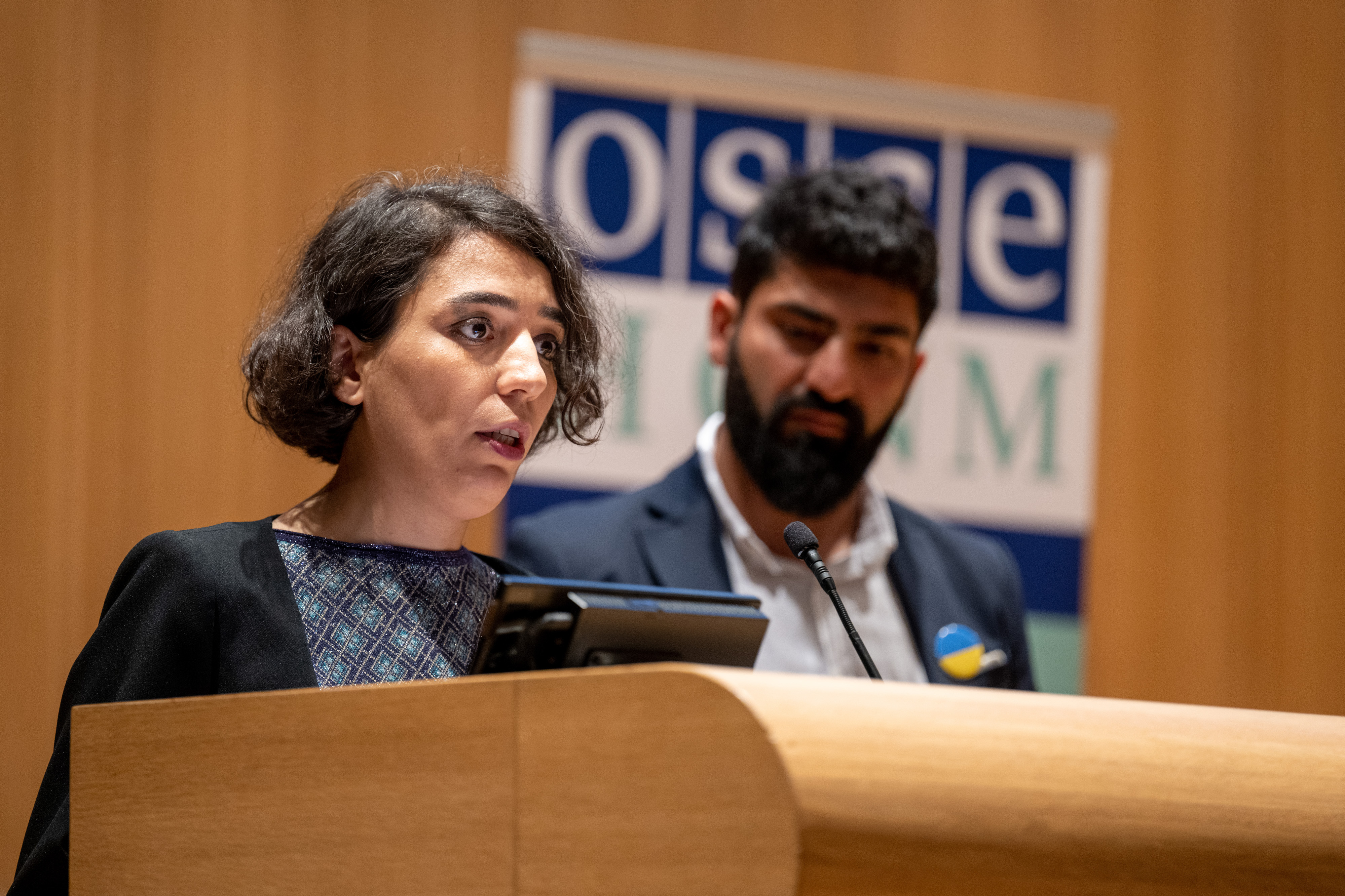 Tamta Mikeladze, Director of the Equality Policy Programme at the Social Justice Center, delivers an acceptance speech, after receiving the 2022 Max van der Stoel Award on behalf of the Social Justice Center, from Georgia, 24 November 2022, The Hague.