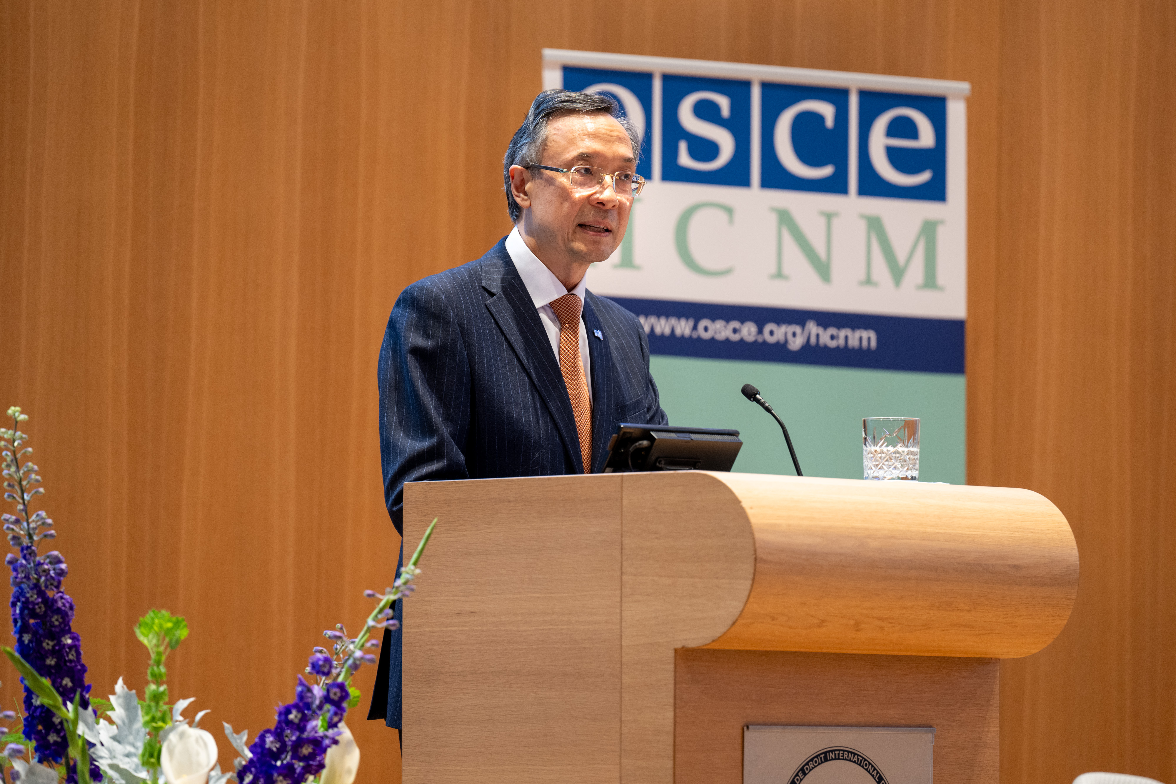 OSCE High Commissioner on National Minorities Kairat Abdrakhmanov opens the conference marking the institution’s 30th anniversary at the Peace Palace, The Hague, 24 October 2023.