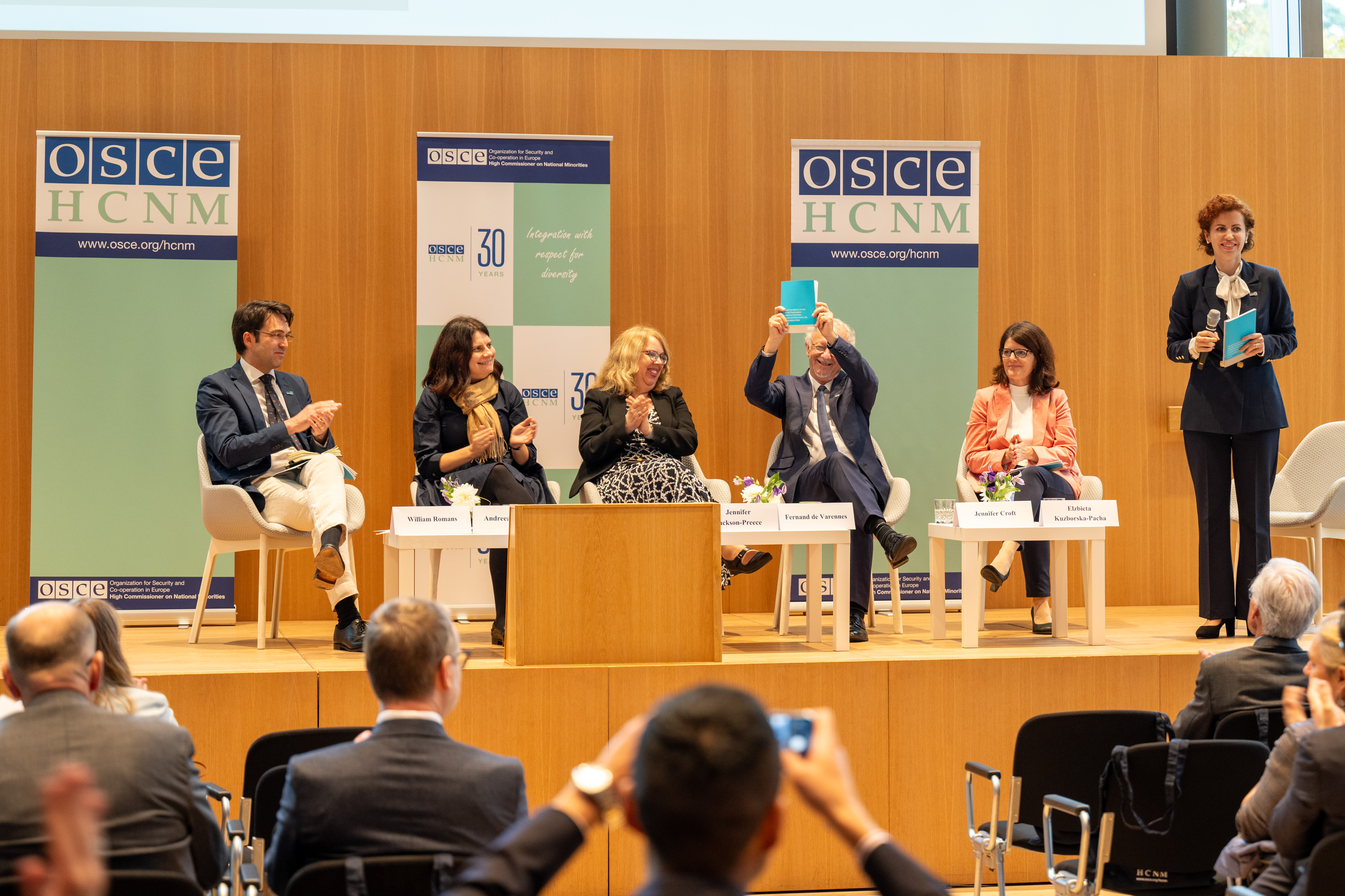 From left: William Romans, Head of Operations, Dispute Resolution, World Bank Accountability Mechanism; Andreea Cârstocea, Senior Researcher, Head of the Equality and Inclusion Cluster, European Centre for Minority Issues; Jennifer Jackson-Preece, Associate Professor of Nationalism, European Institute & Department of International Relations, London School of Economics and Political Science; Fernand de Varennes, Former UN Special Rapporteur on Minority Issues, and Adjunct Professor at the National University of Ireland-Galway and Visiting Professor at the Université Catholique de Lyon; Jennifer Croft, City Ombudsman at the City of Portland; and Elzbieta Kuzborska-Pacha, Senior Legal Adviser, OSCE HCNM present the HCNM’s latest publication, the Recommendations on the Effective Participation of National Minorities in Social and Economic Life, as part of the institution’s 30th anniversary conference at the Peace Palace, The Hague, 24 October 2023.