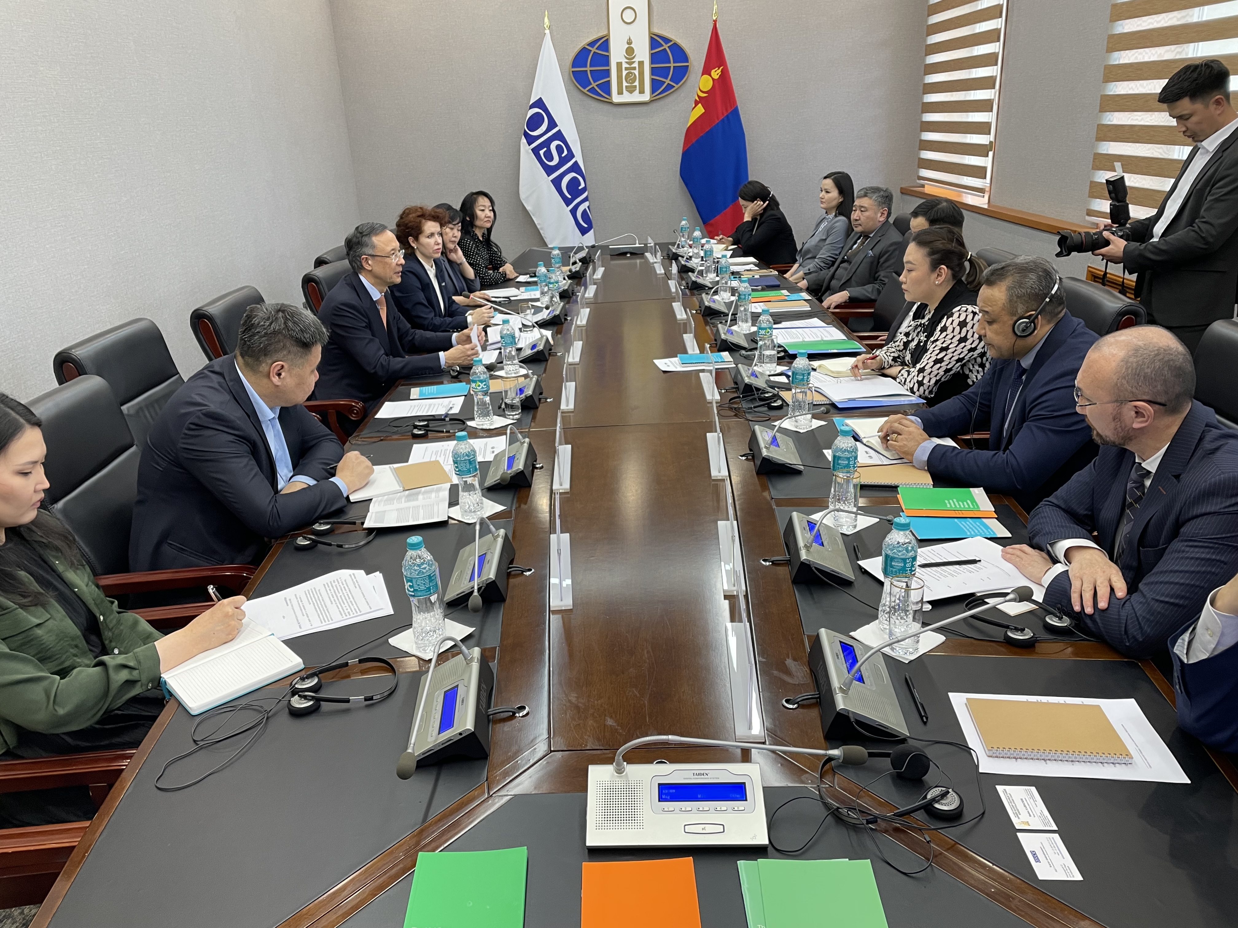 OSCE High Commissioner on National Minorities Kairat Abdrakhmanov (left of table) during the roundtable to present the Recommendations on the Effective Participation of National Minorities in Social and Economic Life, Ulaanbaatar, 2 April 2024.