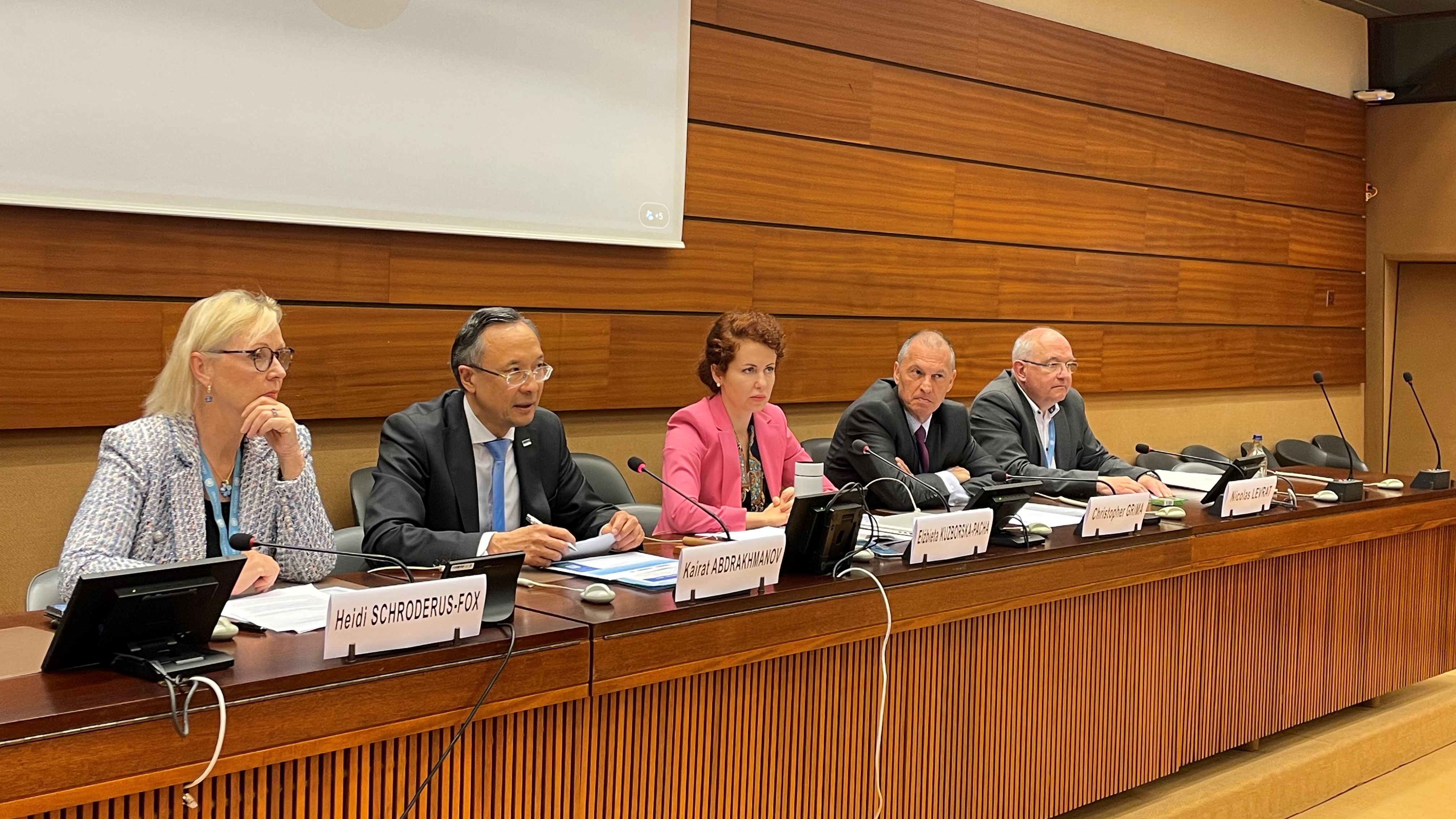 Left to right: Permanent Representative of Finland to the United Nations Office in Geneva Heidi Schroderus-Fox, OSCE High Commissioner on National Minorities Kairat Abdrakhmanov, HCNM Senior Legal Adviser Elzbieta Kuzborska-Pacha, Permanent Representative of Malta to the United Nations Office in Geneva Christopher Grima and UN Special Rapporteur on Minority Issues Nicolas Levrat at a roundtable event exploring the topic: Promoting Conflict Prevention and Building Peace through the Socio-Economic Inclusion of Minority Youth, Palais des Nations, Geneva, 13 May 2024.