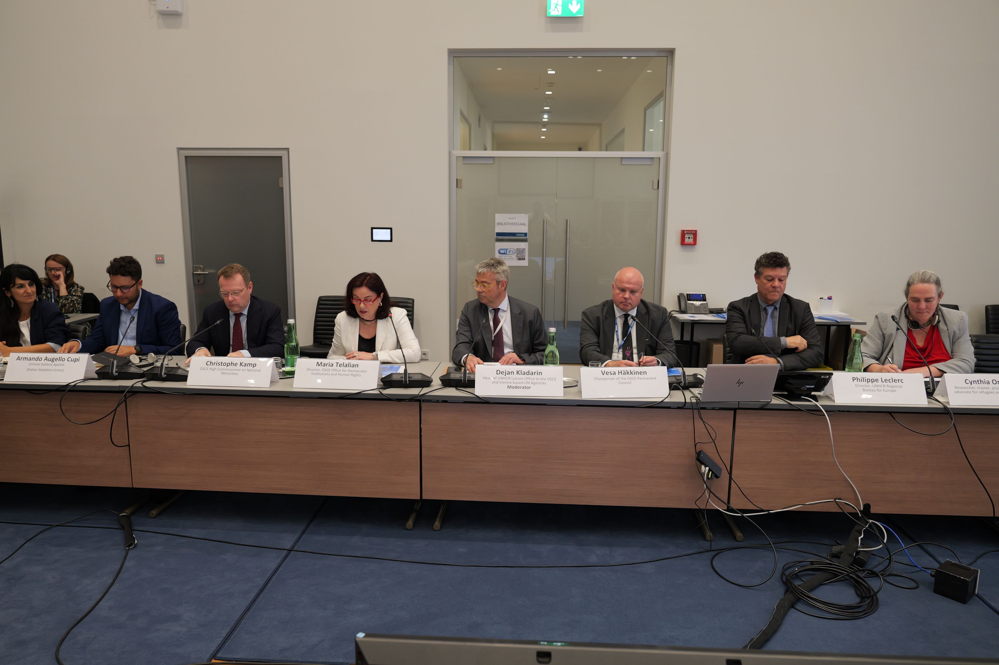 From left to right, Armando Augello Cupi Founder of Unione Italiana Apolidi, OSCE High Commissioner on National Minorities Christophe Kamp, Maria Telalian Director of ODIHR, Dejan Kladarin Head of UNHCR Liaison Office to the OSCE and Vienna-based UN Agencies, Ambassador Vesa Häkkinen Permanent Representative of Finland to the OSCE and Chair of the Permanent Council, Philippe Leclerc Director UNHCR Regional Bureau for Europe, and Cynthia Orchard Researcher and advocate for refugees and stateless people at the launch of the OSCE High Commissioner on National Minorities, OSCE Office for Democratic Institutions and Human Rights and Office of the United Nations High Commissioner for Refugees joint publication on Opening Doors for Children: Prevention of Childhood Statelessness. Good Practices in the OSCE Area, Vienna, 25 July 2025.