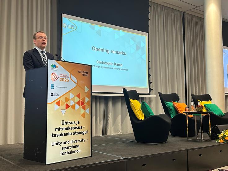 OSCE High Commissioner on National Minorities Christophe Kamp delivers the opening speech at the International Conference on Integration “Unity and diversity – searching for balance”, 12 November 2025, Tallinn.