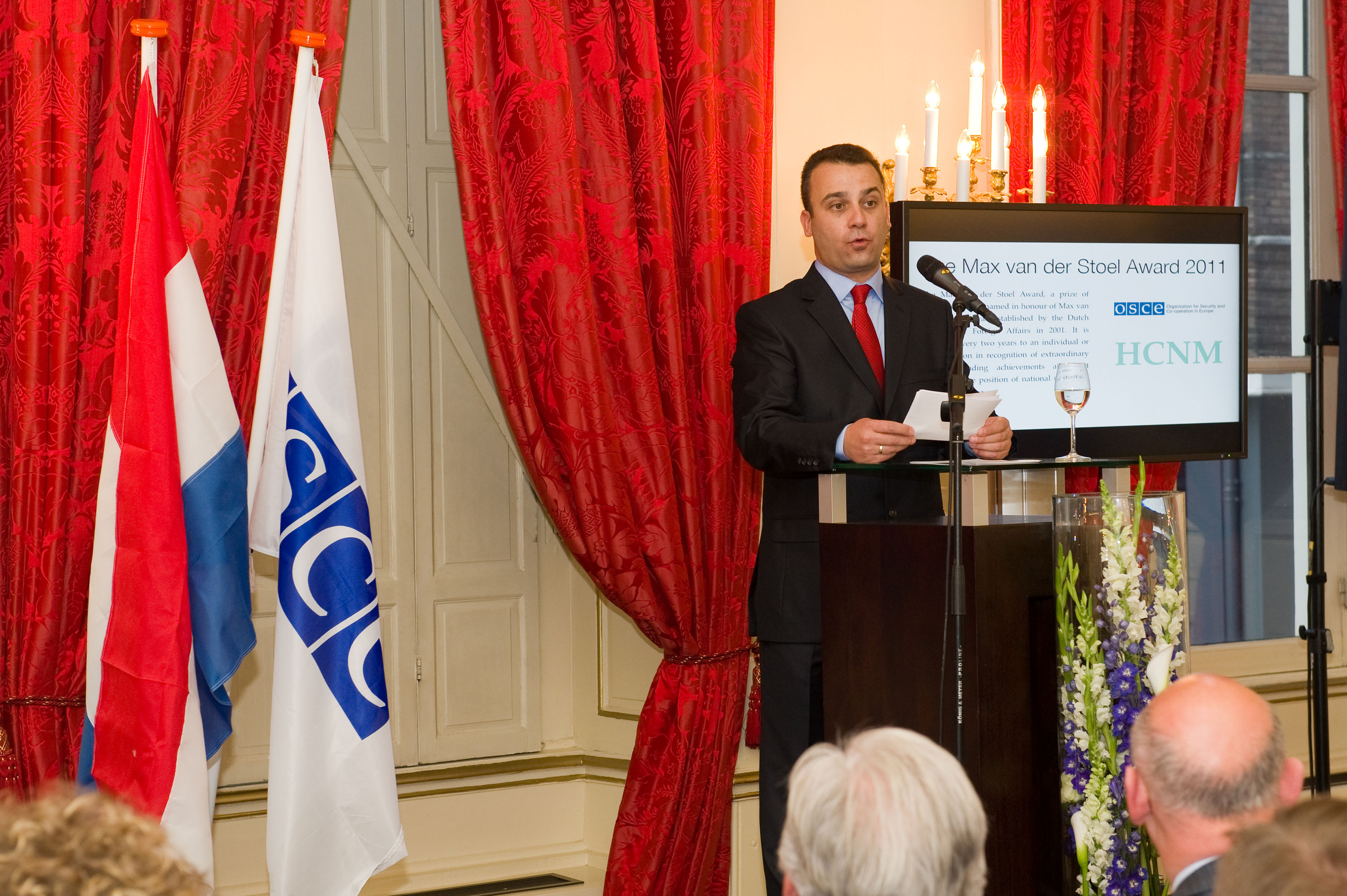 Sasho Stojkovski, Director of the Nansen Dialogue Centre Skopje, delivers the acceptance speech at the Max van der Stoel Award 2011 ceremony on behalf of the winners, the Nansen Dialogue Centre Skopje.