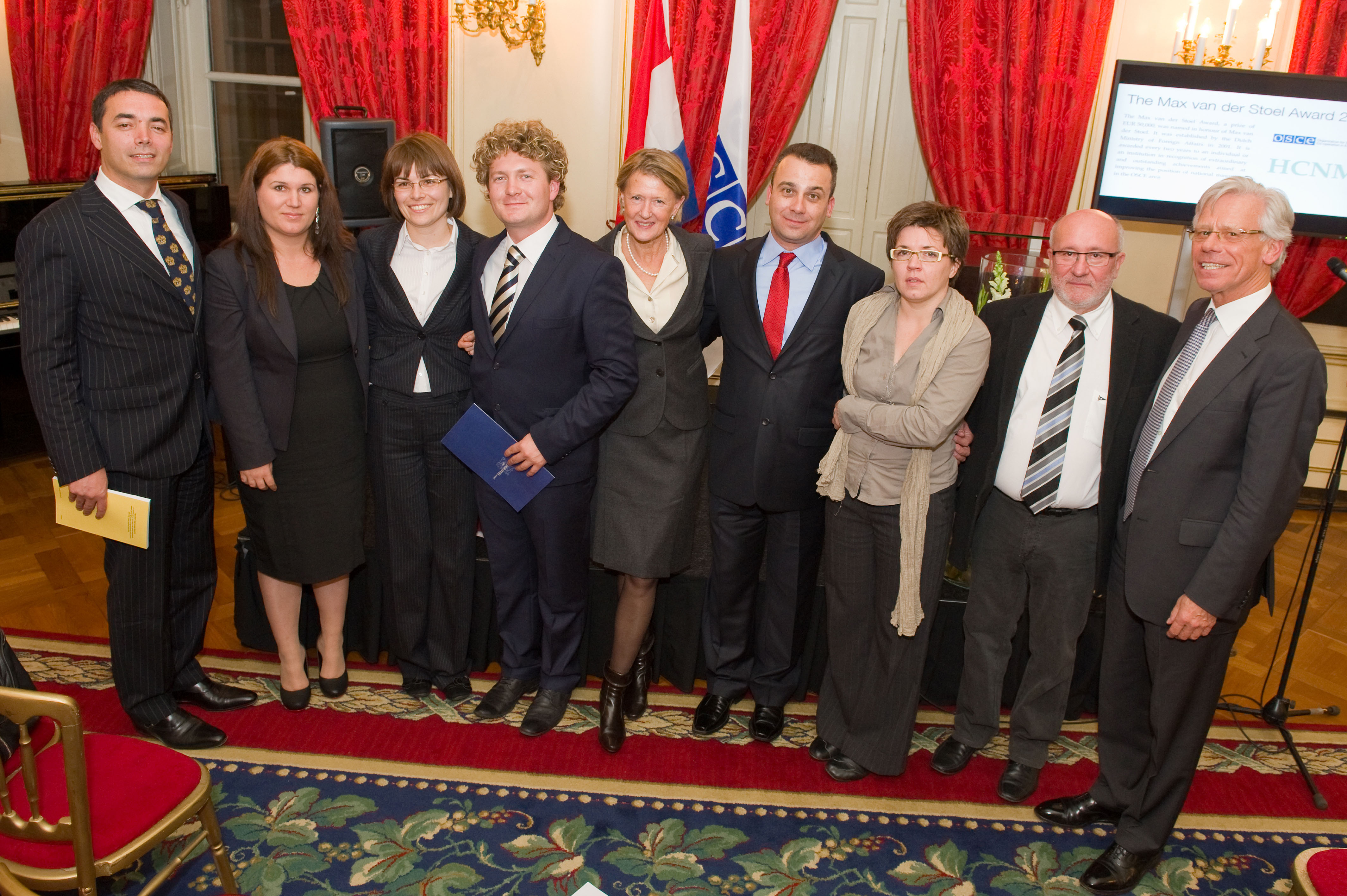 The winners of the Max van der Stoel Award 2011 with the Macedonian Ambassador to the Netherlands, Nikola Dimitrov (l) and OSCE High Commissioner on National Minorities Knut Vollebaek (far right). The Nansen Dialogue Network and Nansen Dialogue Centre Skopje representatives, from 2nd left: Mirlinda Alemdar, Biljana Krstevska-Papic, Veton Zekoli, Bente Knagenhjelm, Sasho Stojkovski, Ivana Milas and Angel Vidal-Alonso.