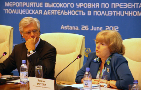 OSCE High Commissioner on National Minorities Knut Vollebaek (l) listens to the Head of the OSCE Centre in Astana, Ambassador Natalia Zarudna, during a high-level event to launch a project on policing in multi-ethnic Kazakhstan, 26 June 2012, Astana.