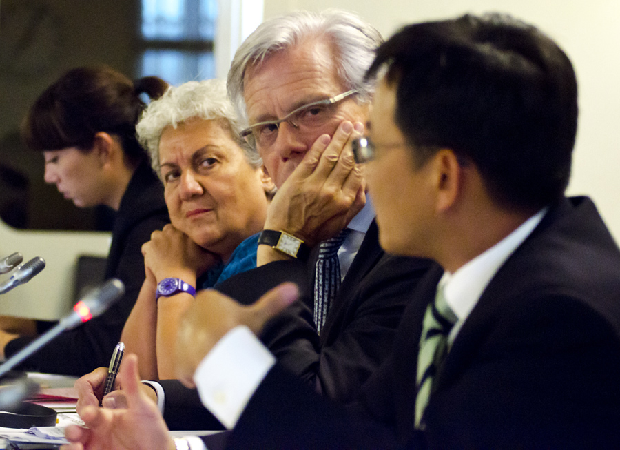 OSCE High Commissioner on National Minorities Knut Vollebaek (c) with the Director of the Centre for Research and Action on Peace in Greece Fotini Sianou (l) and Senior Regional Migrant Assistance Specialist at the IOM office in Vienna Anh Nguyen (r), at a roundtable on women as agents of change, Vienna, 6 September 2012.