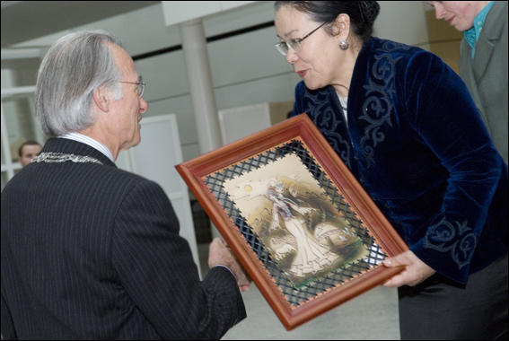 Kyrgyz Education Minister Ishengul Boljurova (right) hands a gift to the The Hague Mayor Jozias van Aartsen after her welcoming speech at an exhibition of children's drawings from Kyrgyzstan, The Hague, 30 September 2008.