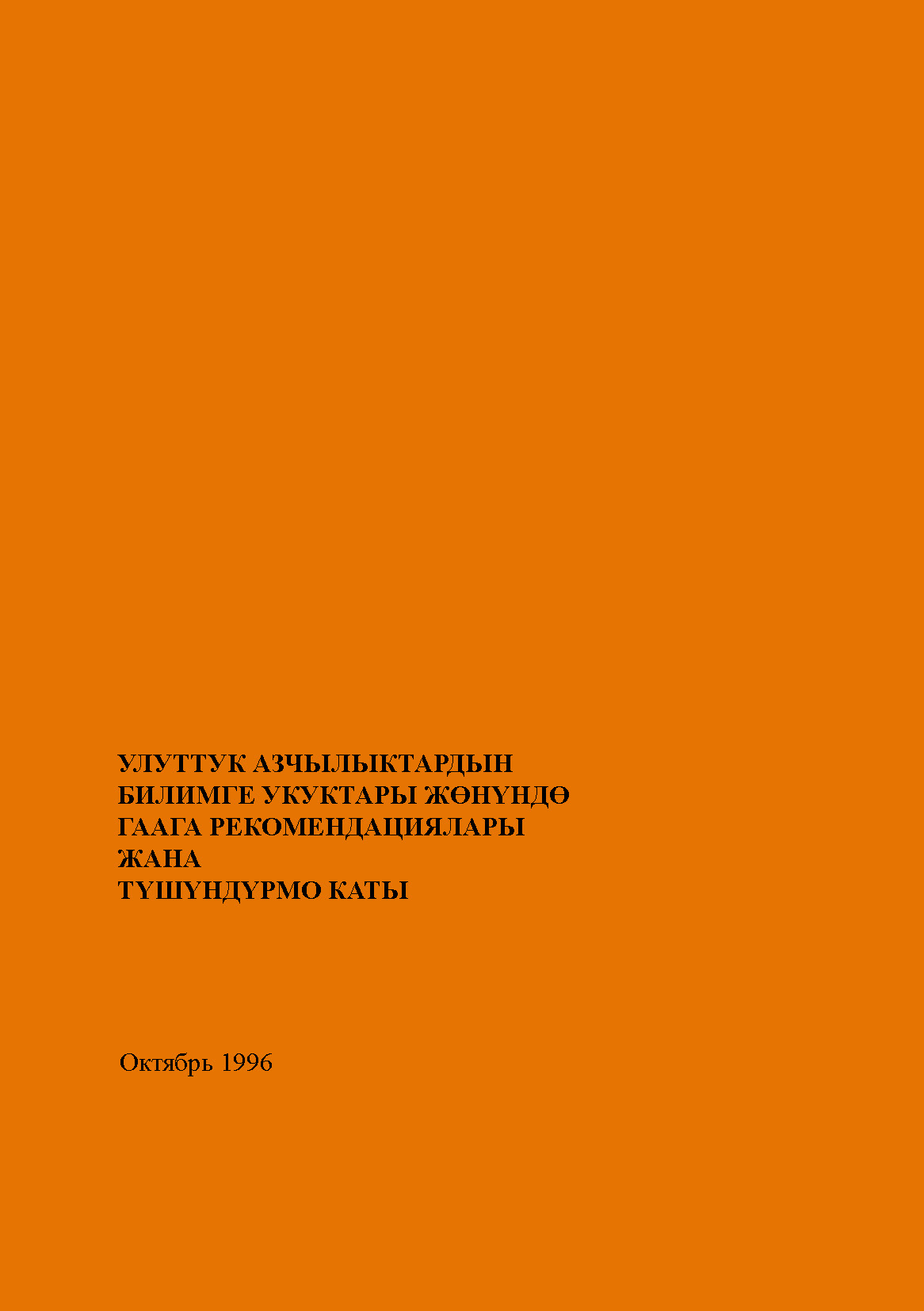Cover of Улуттук Азчьільіктардьін Билимге Укуктарьі Жөнүндө Гаага Рекомендацияларьі Жана Түшүндүрмо Катьі (The Hague Recommendations on the Education Rights of National Minorities)